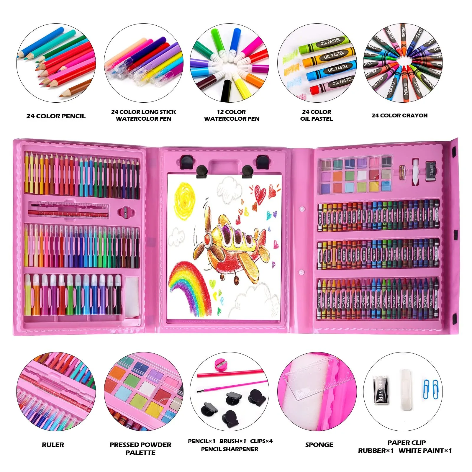 ❤ VERSATILE SET INCLUDES –24 crayons, 48 oil pastels, 24 color pencils, 18 watercolors cake, 24 mini markers, 12 broad markers, 10 sheets white paper, 4 lager clips, 3 paper clips, 1 HB pencil, 1 paint brush, 1 ruler, 1 eraser, 1 palettte, 1 pencil sharpener, 1 sponge, 1 white water colour tube, 1 trifold organginzer case and more!
